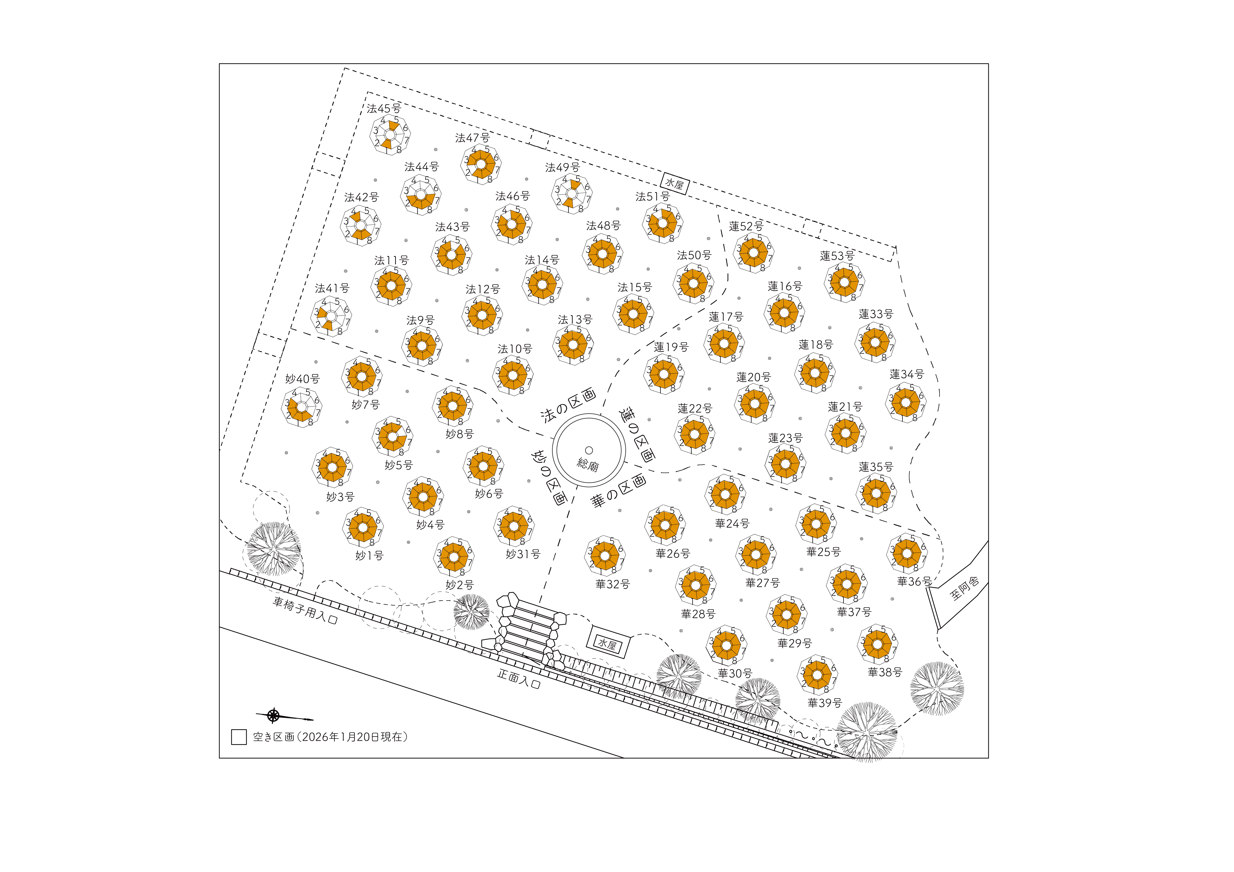 『安穏廟』は2022年6月に全1064区画が満杯となりました。引き続きお問い合わせと申込み希望が多いため、2023年8月『安穏廟・杜の安穏ー池の上』に112区画の最終造設を完成し受付を再開しました。色塗りの区画が契約済、白抜き区画が空きの状況です。残数は日々変化していますので、お早めにお問い合わせください。