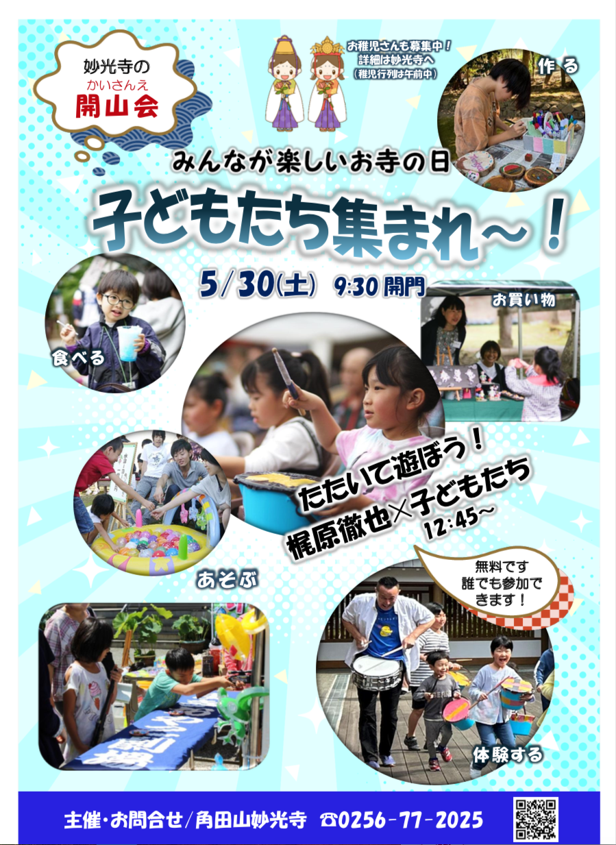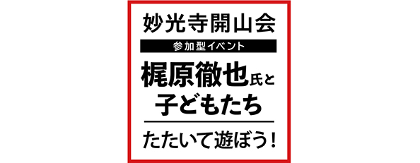 「妙光寺開山会」第二部に、今年もドラム界のレジェンドと称される梶原徹也さんによる、子どもたちと一緒に「たたいて遊ぶ!」楽しい太鼓の奉納演奏を開催いたします。
